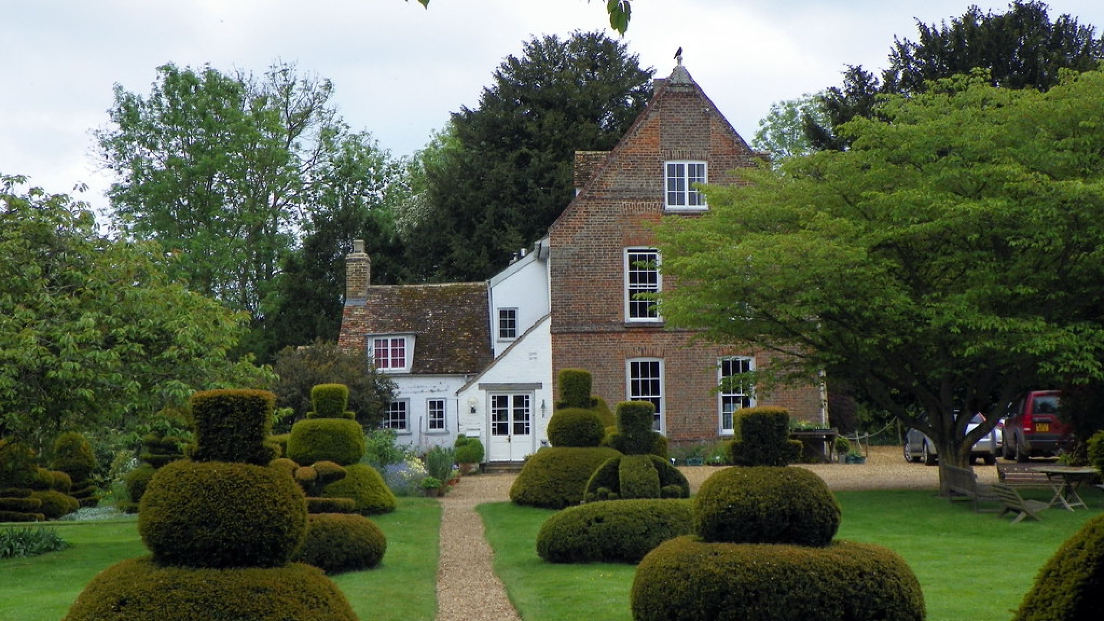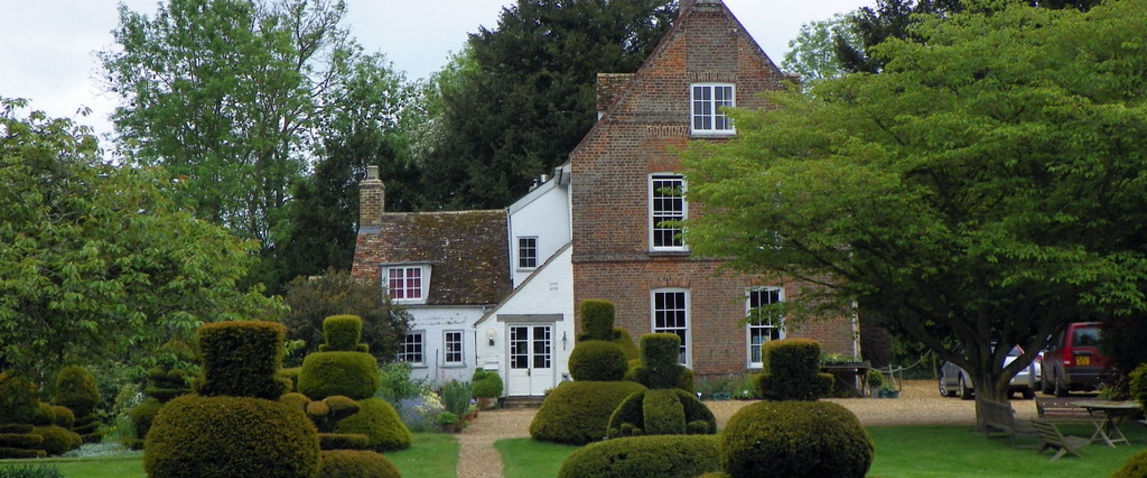 The Manor, Manor Hemingford Grey, is a house in the village of Hemingford Grey, Cambridgeshire. Built about 1130 by Payn Osmundsen, tenant of Aubrey de Vere. 1256 – 1490 owned by the de Grey family then, amongst others, Edmund Dudley, Henry VII’s favourite and Richard Cromwell, Oliver’s grandfather. Lucy Boston bought the house in 1939 and restored it, as much as possible, back to its Norman original. None of Lucy’s predecessors at The Manor had given much time to the garden so it was more or less two fields. During the war years she planted mostly trees and shrubs. As a child she was fascinated by the topiary at Levens’ Hall so she planted eight 10” high yew plants on either side of the path to the river. These became cones and then for the Queen’s coronation she clipped them into crowns, orbs and the dove of peace from the old sceptre. After the war she started to garden in earnest, collecting old roses and irises with the help and advice of Graham Stuart Thomas. Now in the front garden we have a meadow patch with fritillaries followed by marsh orchids. The herbaceous borders are filled with plants to flower throughout the seasons.