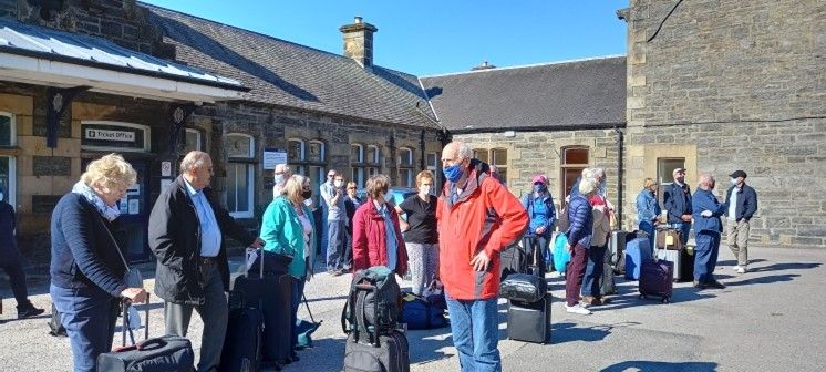 Getting to Inverness gave several options but for most of the group, going by train proved to be popular with only 2 deciding to drive and extend their holiday afterwards. But by which train then became a question? Catching the 12.00 through train from Kings Cross was favoured by about half but the remainder had never experienced the sleeper train, and so berths were arranged for 9 couples and 4 singles. Even with Covid restrictions still in place, both trains were very crowded. The day train travellers arrived on schedule in mid-evening to enjoy a late dinner even though they had been well fed and watered along the way. The sleeper passengers were not so lucky; after a prompt start from Euston and getting used to the idiosyncrasies of the cabin, the group settled down for some fitful sleep. Not long after Perth, the fire alarm aroused those not yet awake and the train ground to a halt. Eventually, we were told that the second locomotive had caught fire and that electric power to the train would be restricted. Fortunately, the first locomotive was able to take us to Kingussie (see picture) whence busses were arranged for the onward journey to Inverness.